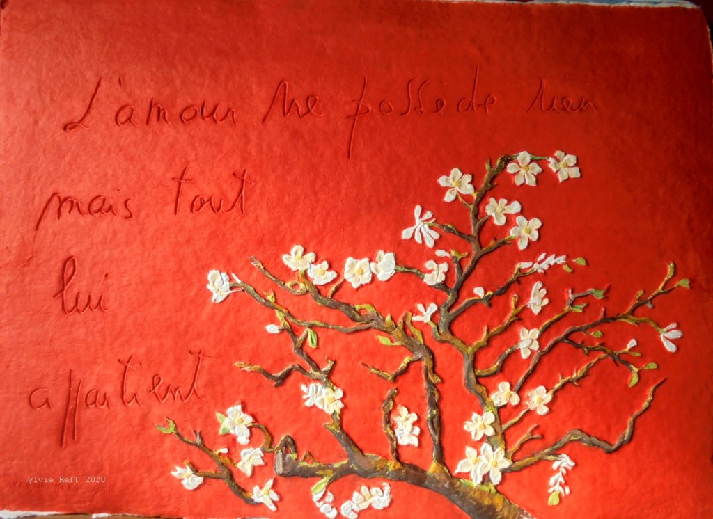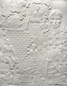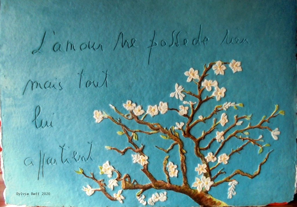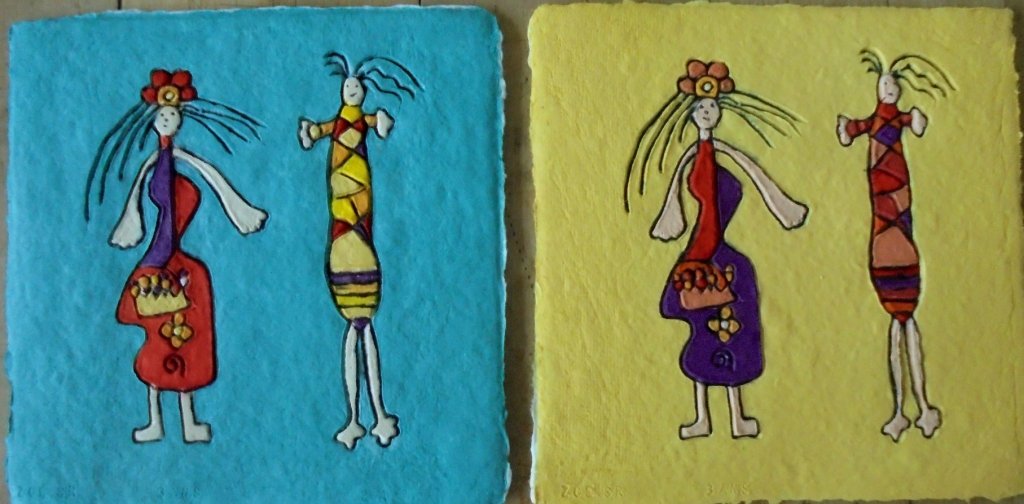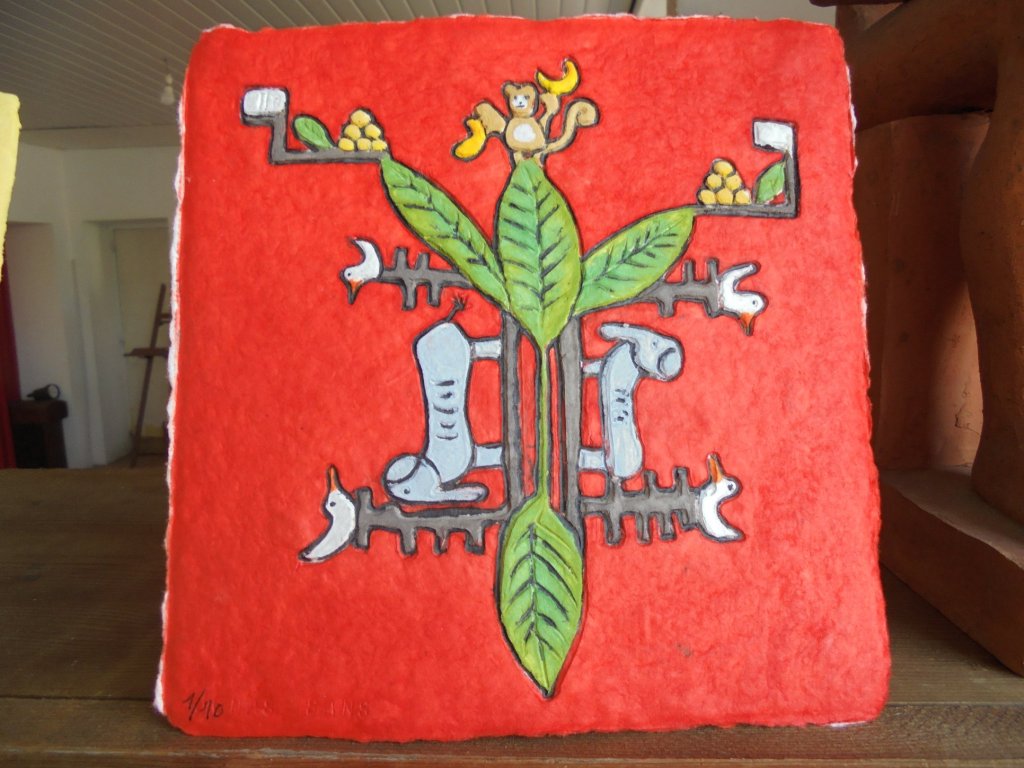 Cette technique se caractérise par la création simultanée du papier et de la gravure. L’artiste grave et sculpte son motif en bas relief avec diverses possibilités de matériaux : bois, cire, bronze, terre etc. Un moule souple est réalisé à partir de cette création. La feuille de papier est fabriquée dans l’atelier avec de la pâte à papier, puis déposée au format choisi, sur un support dans la presse.