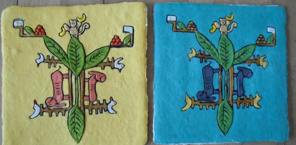 Le moule est coloré « à la poupée », technique manuelle, pour chaque estampe, avant d’être positionné sur la pâte à papier. Le pressage se fait graduellement jusqu’à atteindre plusieurs tonnes.