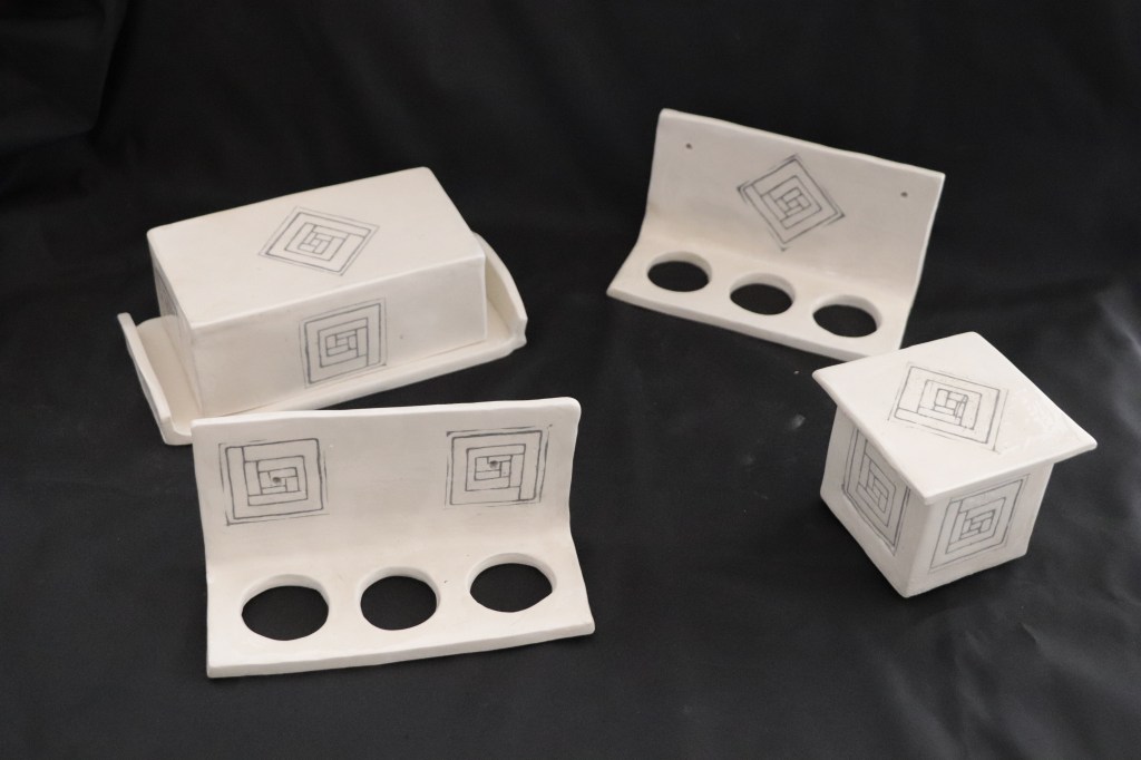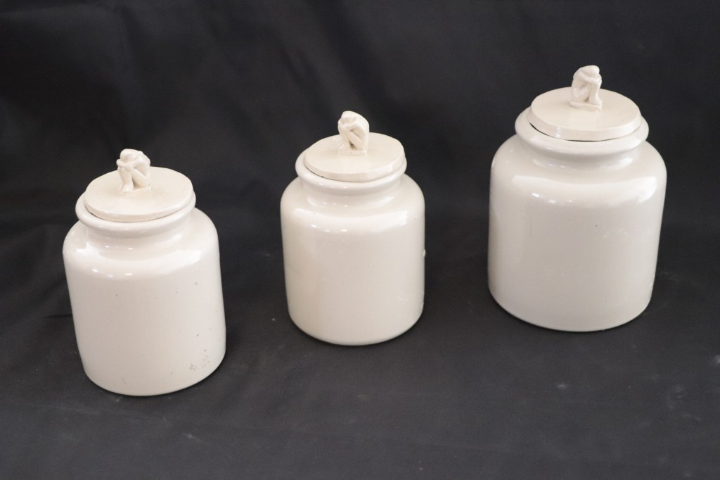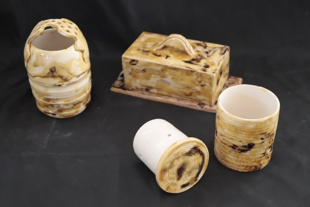Un vase pique fleurs 30€: un beurrier rectangle 40€: un beurrier breton ( à eau) 35€.