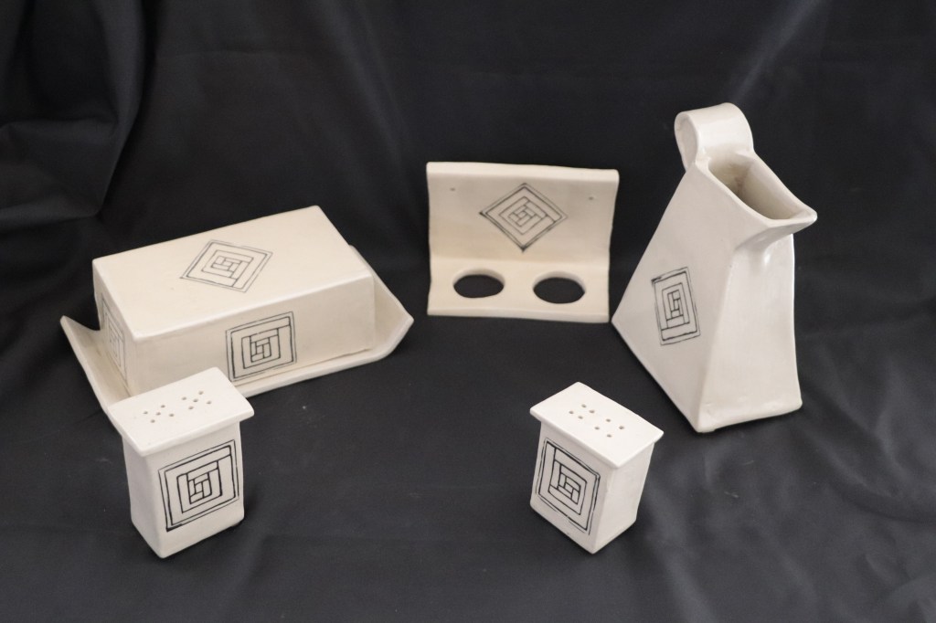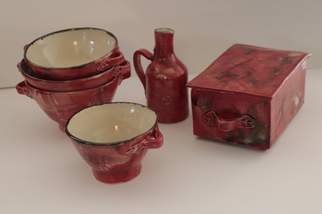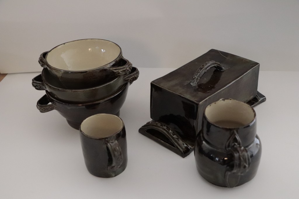 Ensemble pièce unique: 3 bols, une tasse à café, un beurrier + un pichet. Gré émaillé: 270€: Vendu à la sortie du four…