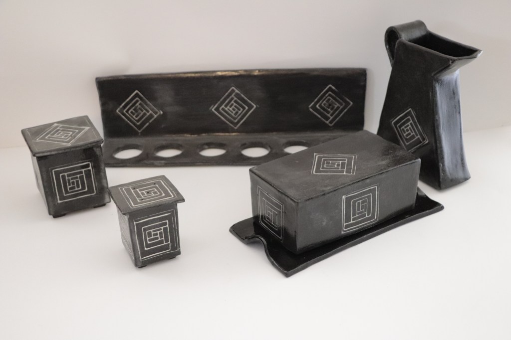 Ensemble pièce unique: un porte oeufs mural, un pichet, un beurrier, une salière + boîte à couvercle: grès noir émaillé: 240€