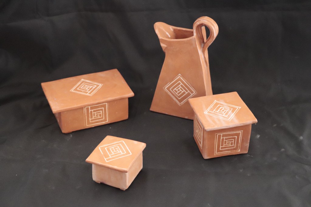 Ensemble pièce unique: un beurrier breton ( à eau), un pichet + 2 boîtes à couvercle. Faïence rouge émaillée 155€
